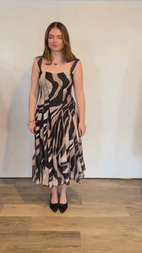 Striking neutral abstract print in black, sand, and soft beige